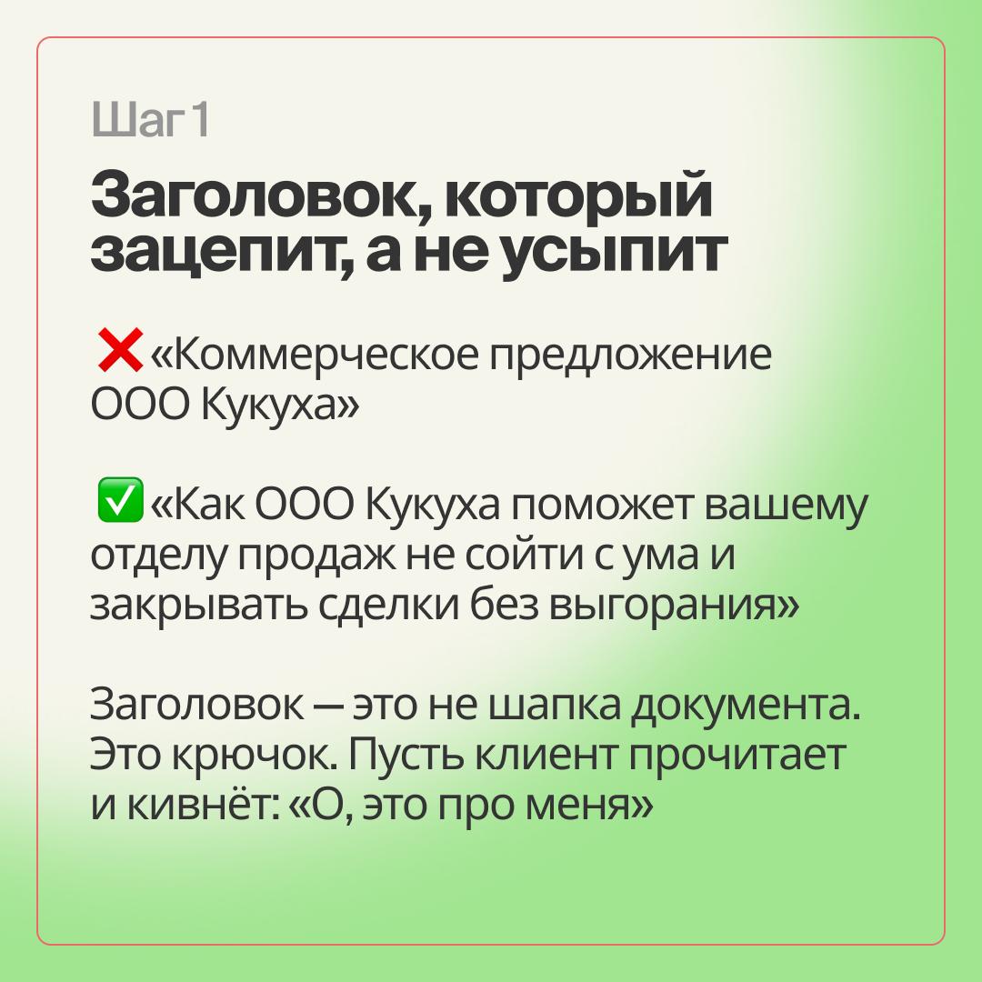 Не стоит использовать стандартные и скучные формулировки вроде «Коммерческое предложение ООО Кукуха». Такой заголовок не вызывает эмоций и не демонстрирует выгоду для клиента.