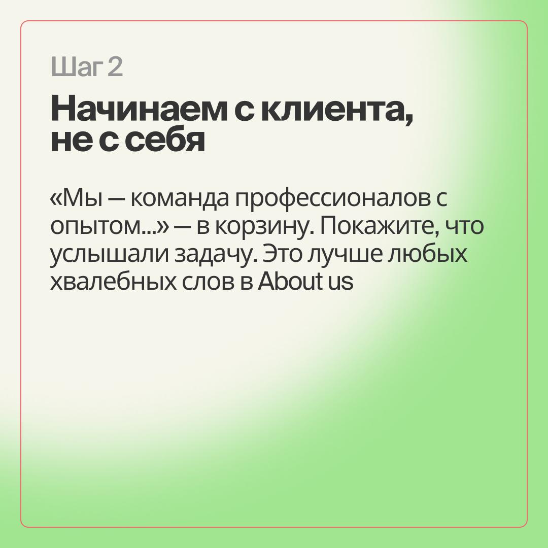 Гораздо лучше показать, что вы внимательно выслушали клиента и понимаете его задачи. Это гораздо убедительнее любых хвалебных слов из раздела «О нас».