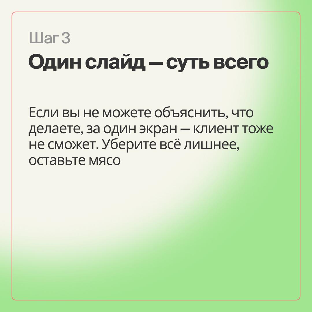 Если вы не можете объяснить, чем занимаетесь, на одном экране — клиент тоже не поймёт.