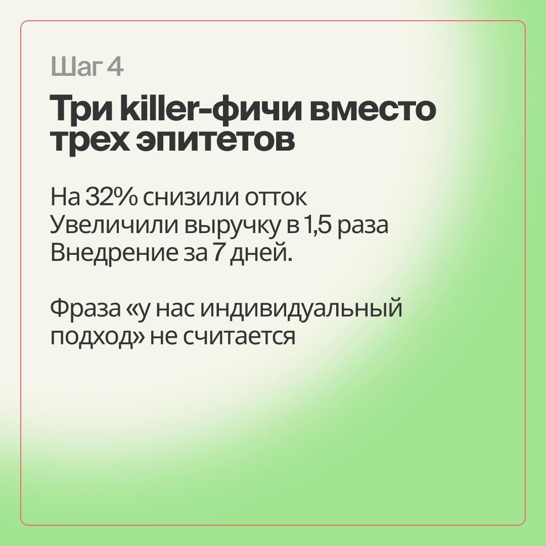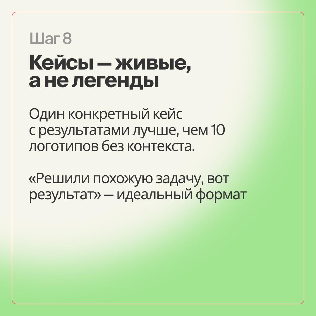 Такие факты гораздо убедительнее и показывают реальную ценность вашего продукта или услуги. Фраза «у нас индивидуальный подход» уже не работает — докажите это цифрами и результатами.