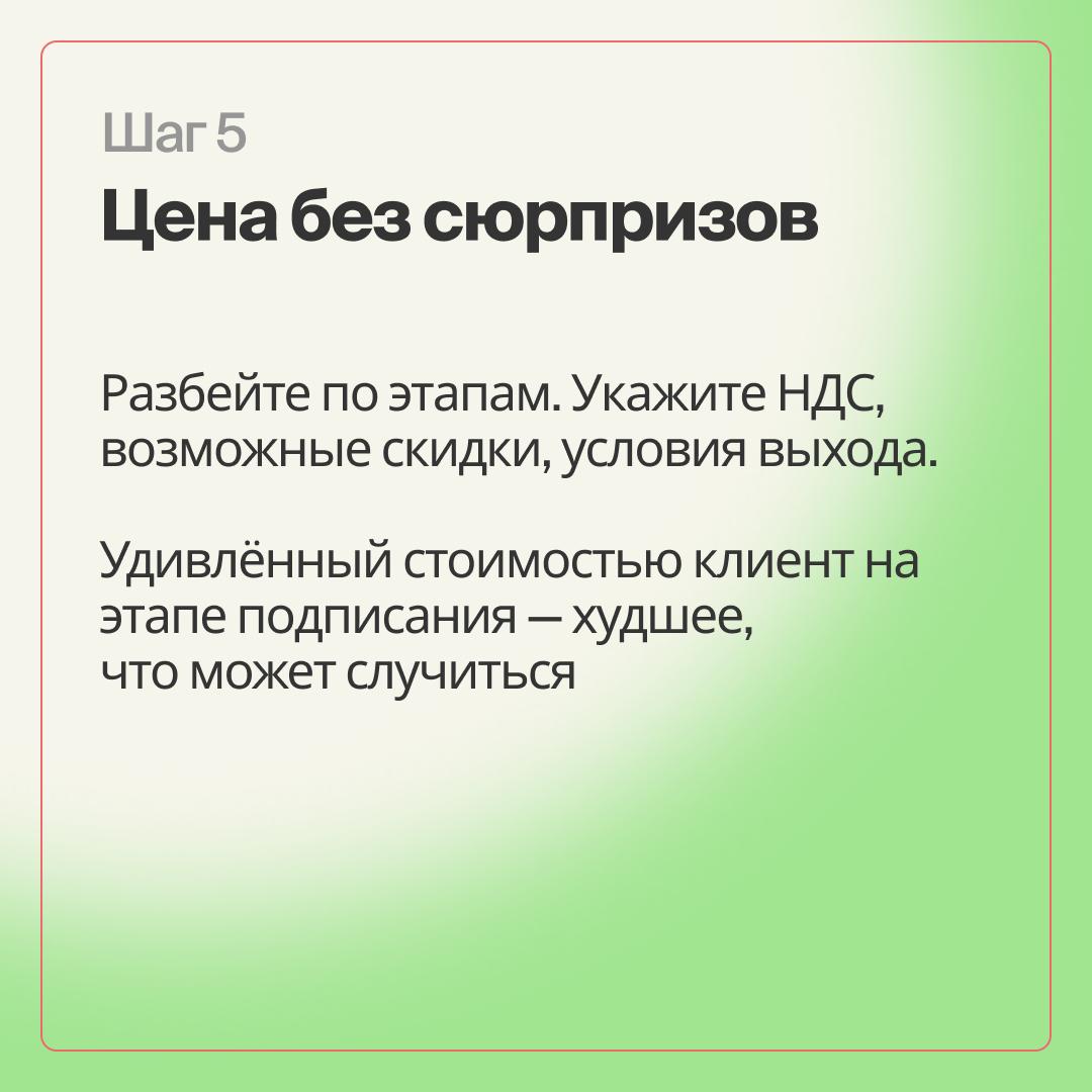 Удивлённый стоимостью клиент на этапе подписания — худшее, что может случиться. Чтобы избежать этого, будьте максимально открыты и конкретны.