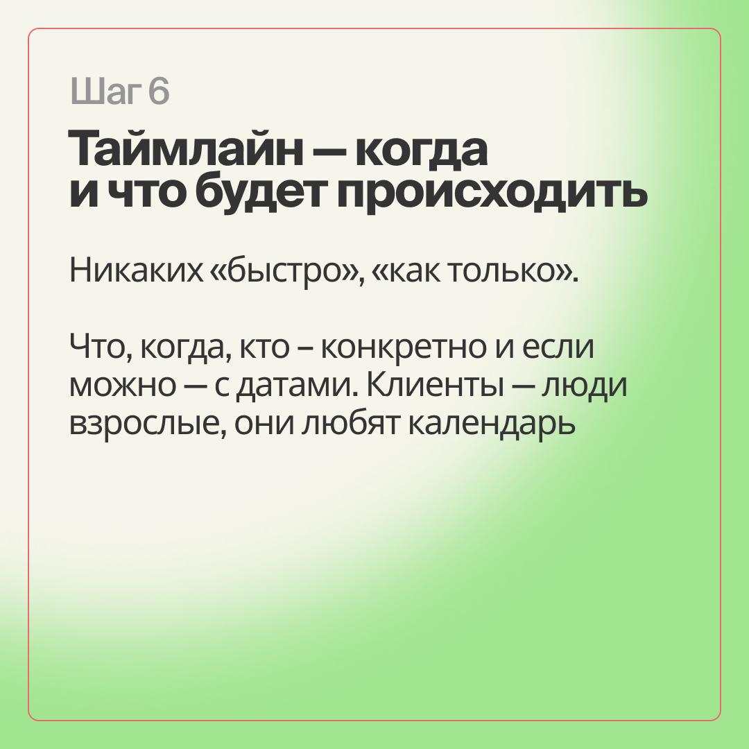 Избегайте расплывчатых формулировок типа «быстро» или «как только». Клиенты — взрослые люди, они любят конкретику и планирование.