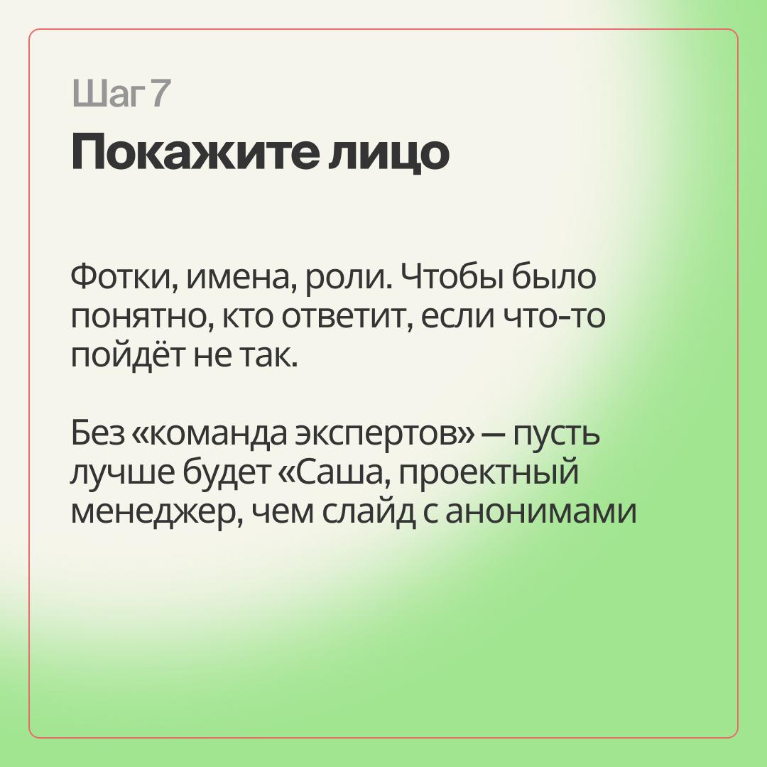 Избегайте обобщений вроде «команда экспертов» — лучше укажите конкретно: «Саша, проектный менеджер», вместо слайда с анонимными фигурами.