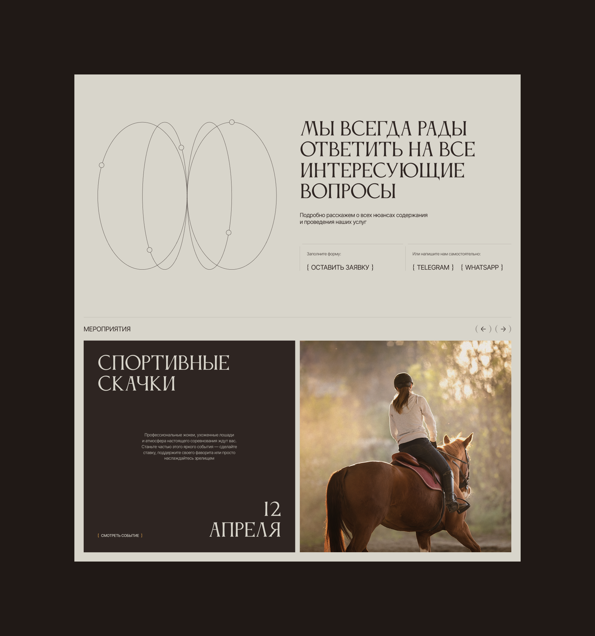 Из админки управляется: Лошадки, инструкторы, услуги, мероприятия, фиксируются заявки на услуги.