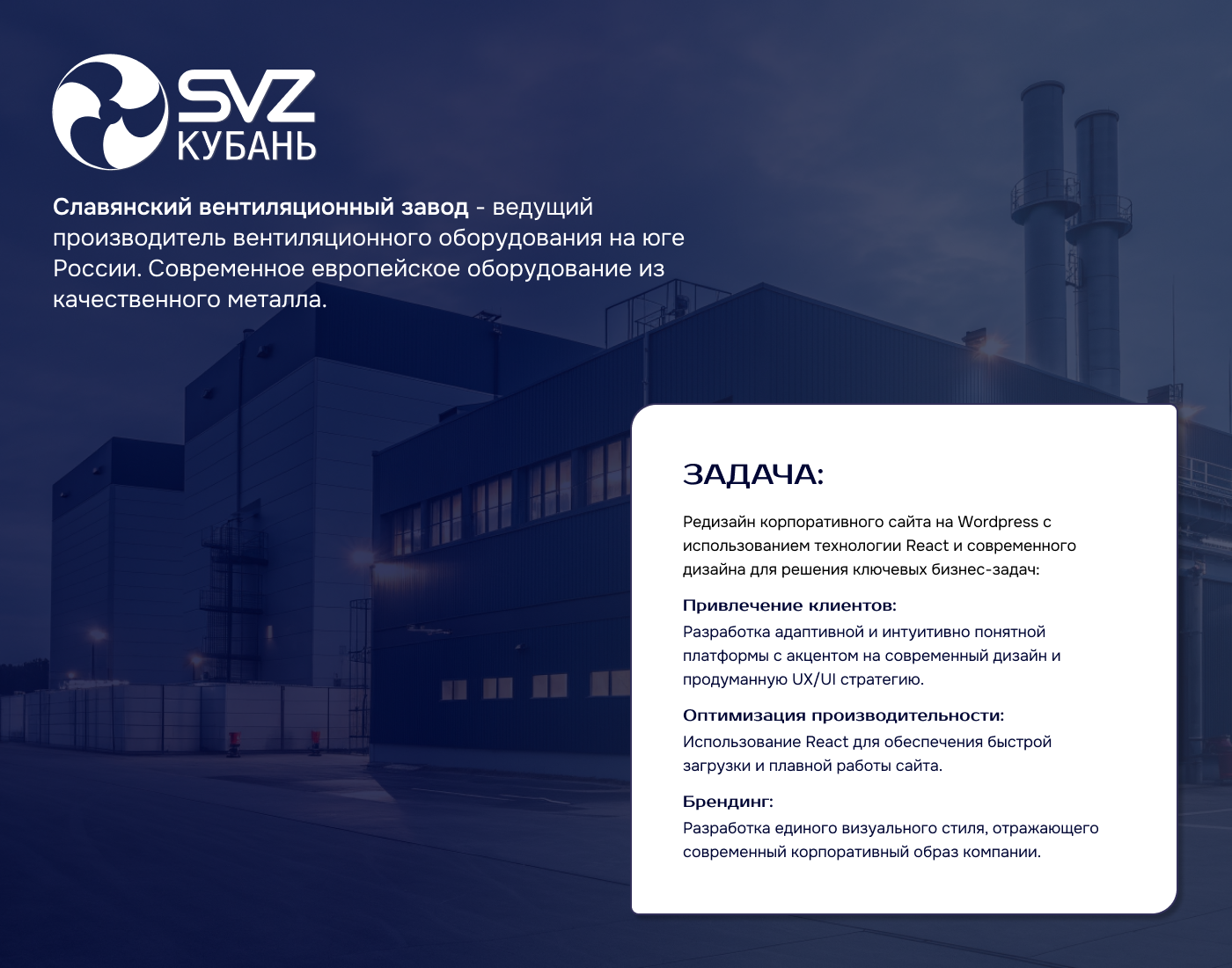 “Славянский Вентиляционный Завод Кубань” Ведущий производитель вентиляционного оборудования на юге России. 15 лет на рынке, 500+ контрагентов, 1000m2 производство в день.