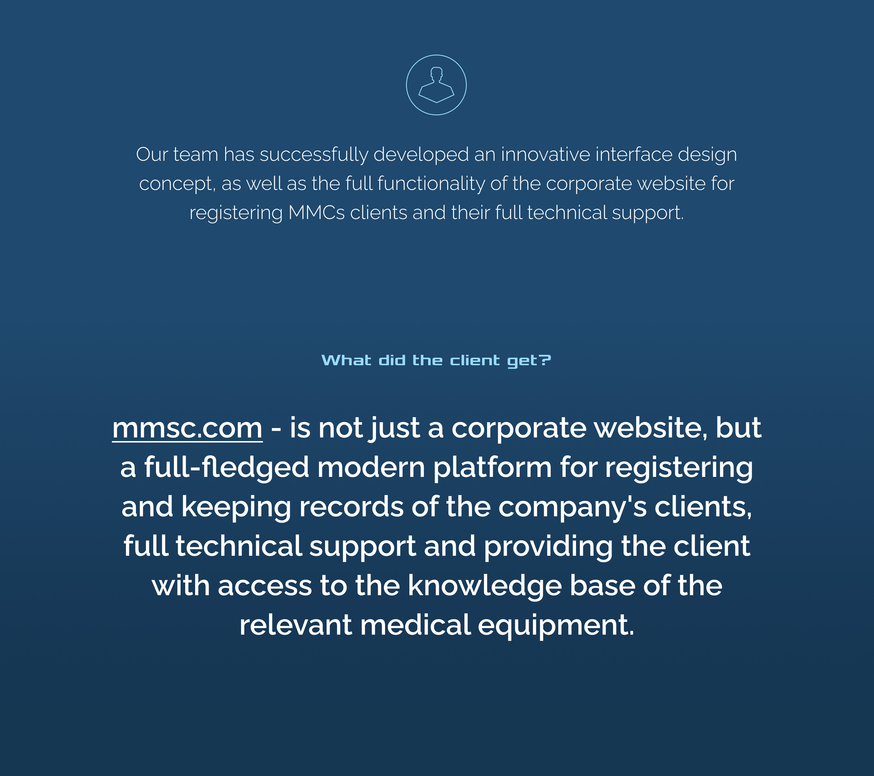 Мультиязычная адаптированная под различные устройства современная платформа со scrollspy-меню, интерактивными свайп-каруселями и тайм-лайнами, плавными мягкими анимациями, новостным блогом, каталогом продукции и формами обратной связи. Реализованы личные кабинеты клиента и менеджера с индивидуальным функционалом. Менеджеру доступны список текущих клиентов, регистрация новых пользователей и предоставление доступа к технической документации оборудования. После регистрации и получении доступа, клиент получает возможность просматривать техническую документацию оборудования, а также подавать запрос в техническую поддержку. Запросы фиксируются в панели управления сайтом и доступны администратору. Минимально функционирующий продукт сдан в сроки и с положительным отзывом от заказчика.
