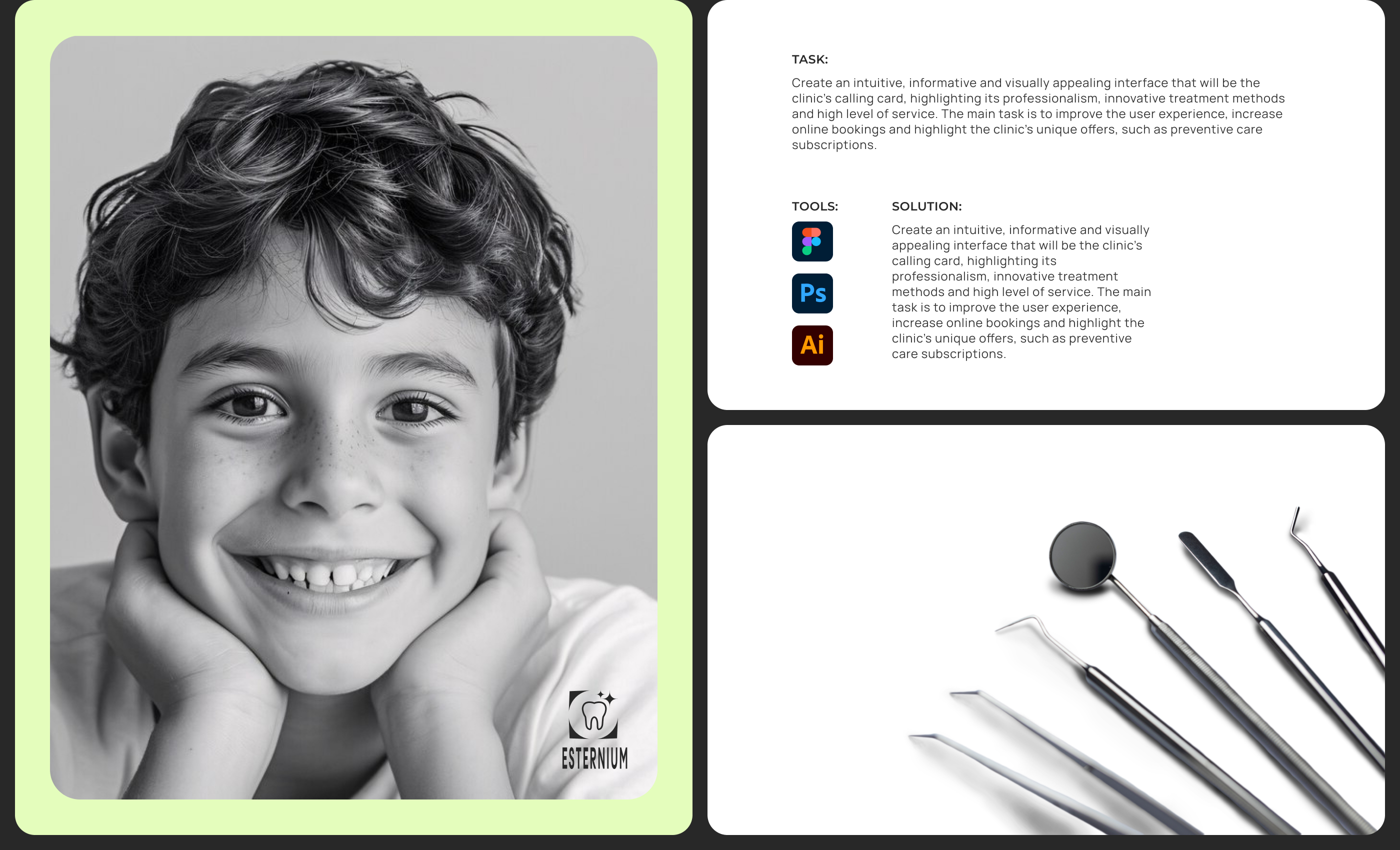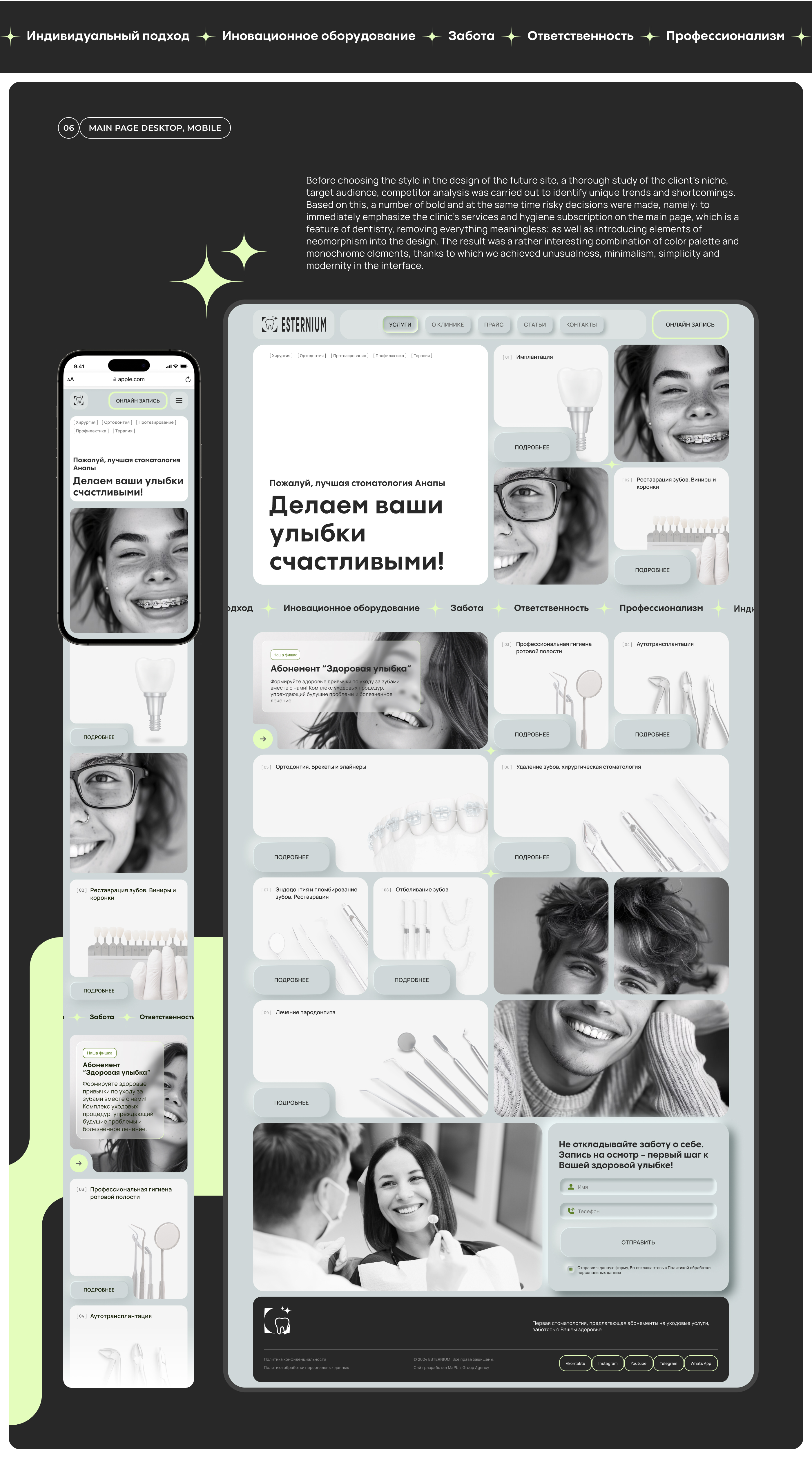Решение внедрить элементы неоморфизма в дизайн в виде плашек, кнопок и полей ввода. Получилось интересное сочетание цветовой палитры, монохромных элементов и простой навигации в интерфейсе. На выходе не стандартный сайт стоматологии с своим вайбом и минимализм, простота и современность.